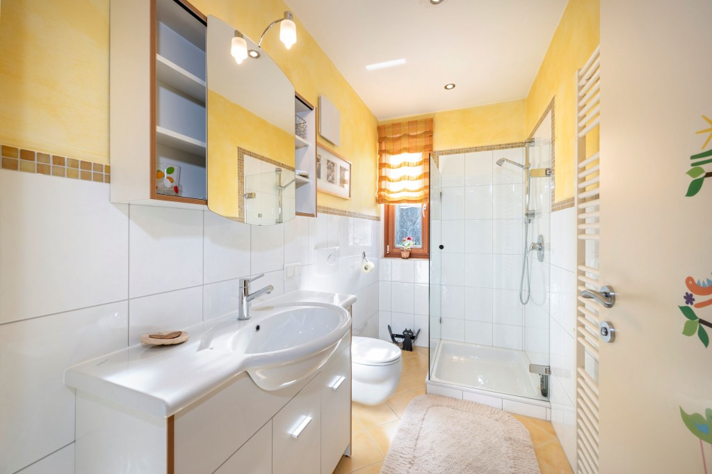 Im Obergeschoss liegen zwei Schlafzimmer, jeweils mit eigenem Bad – eines davon mit Ankleide.