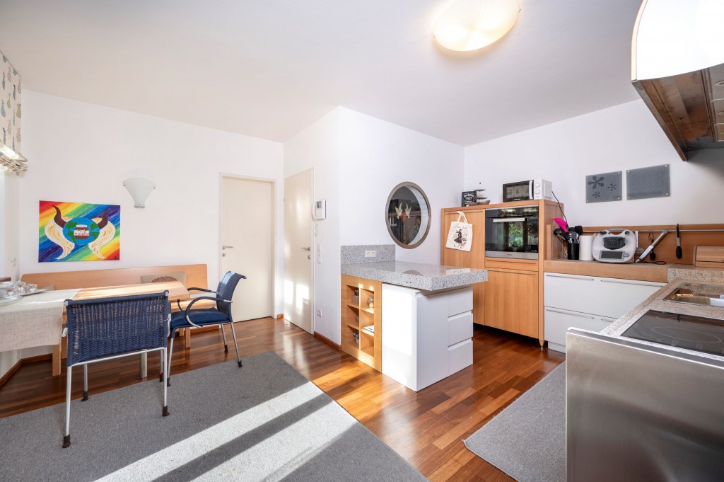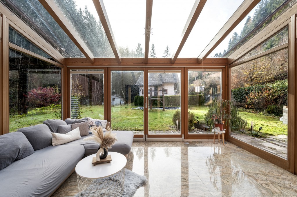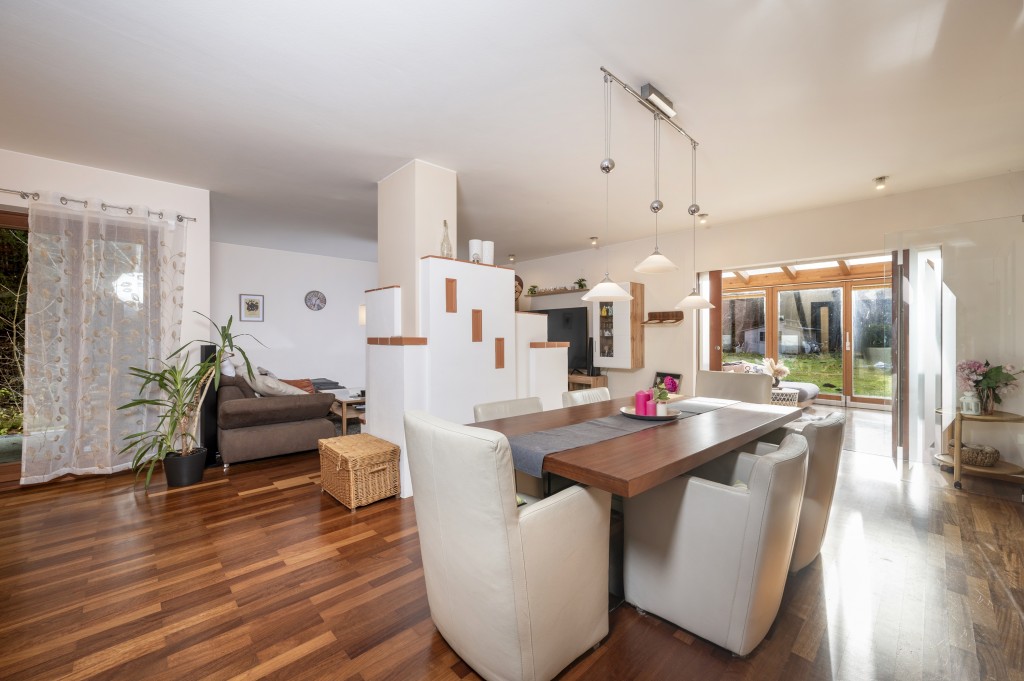 Schon im Eingangsbereich zeigen sich hochwertige Materialien wie Granit- und Steinelemente sowie eine klare, stimmige Gestaltung. Im Erdgeschoss befinden sich ein großzügiges Entree, Gäste-WC, eine italienische Einbauküche mit Essbereich und Zugang in den Garten sowie ein heller Wohn- und Essbereich mit Wintergarten. Ein Kachelofen sorgt für zusätzliche Wärme. Praktisch ist der direkte Zugang von der Doppelgarage sowie der zusätzliche Abstellraum.